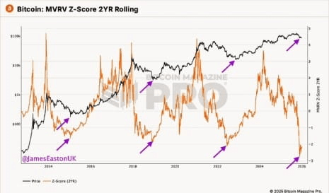Scorul MVRV Z pe 2 ani a scăzut la unul dintre cele mai adânci niveluri vreodată înregistrate, împingând Bitcoin într-o zonă care a precedat istoric inversările majore de trend.