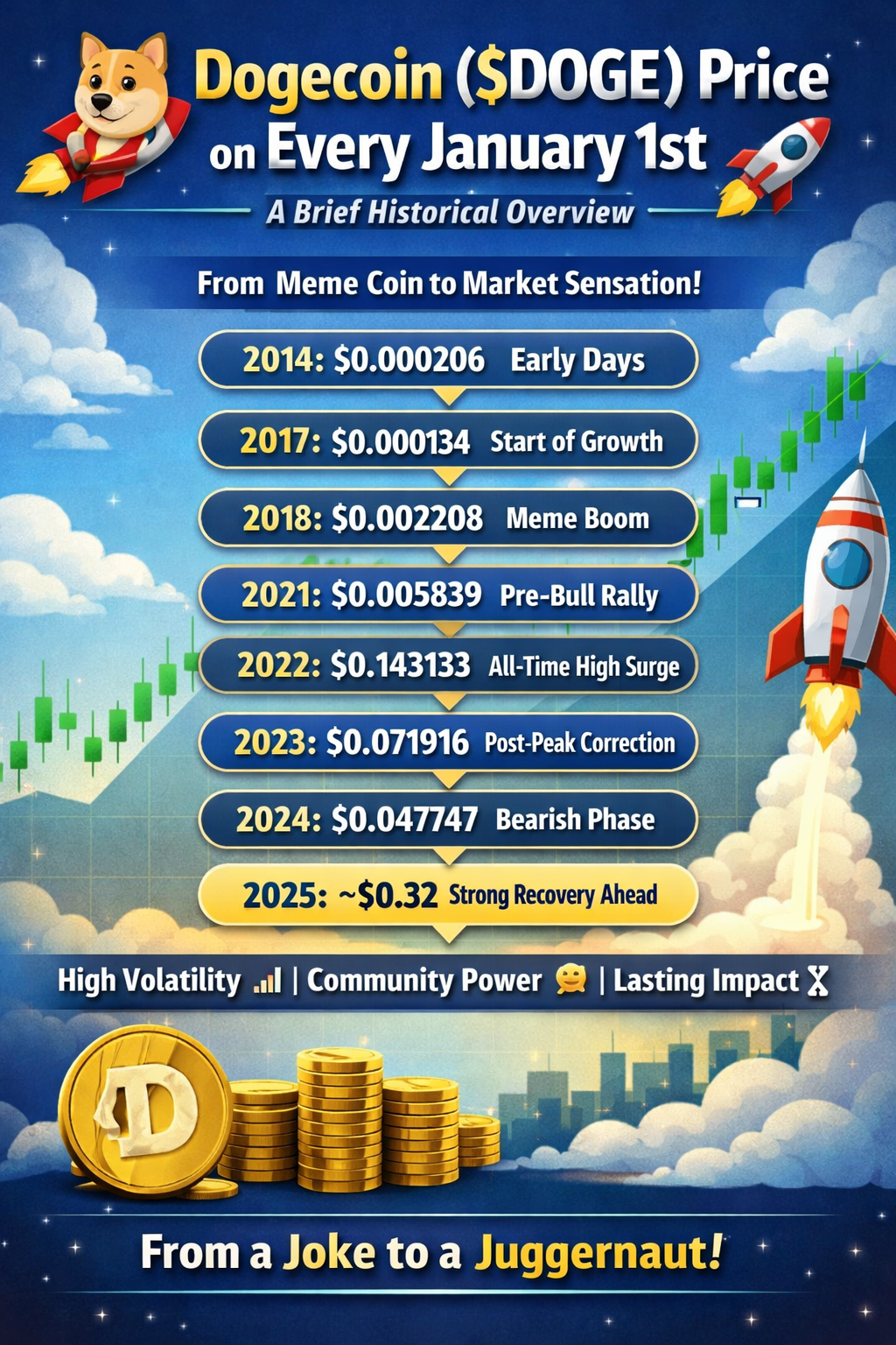 De-a lungul anilor, parcursul Dogecoin pe 1 ianuarie reflectă atât volatilitatea, cât și evoluția pe termen lung a criptomonedelor meme, trecând de la fracțiuni de cenți la prețuri semnificative pe măsură ce interesul investitorilor și maturitatea pieței au crescut. �