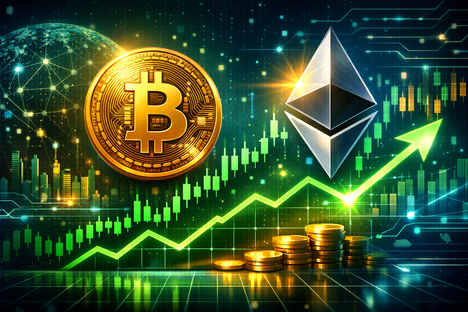 O ilustrație modernă a pieței cripto care arată logo-urile Bitcoin și Ethereum crescând pe un grafic digital, lumânări verzi, fundal blockchain strălucitor și un temă financiară globală.#BTC90kChristmas #StrategyBTCPurchase #CPIWatch #BTCVSGOLD #Token2049Singapore