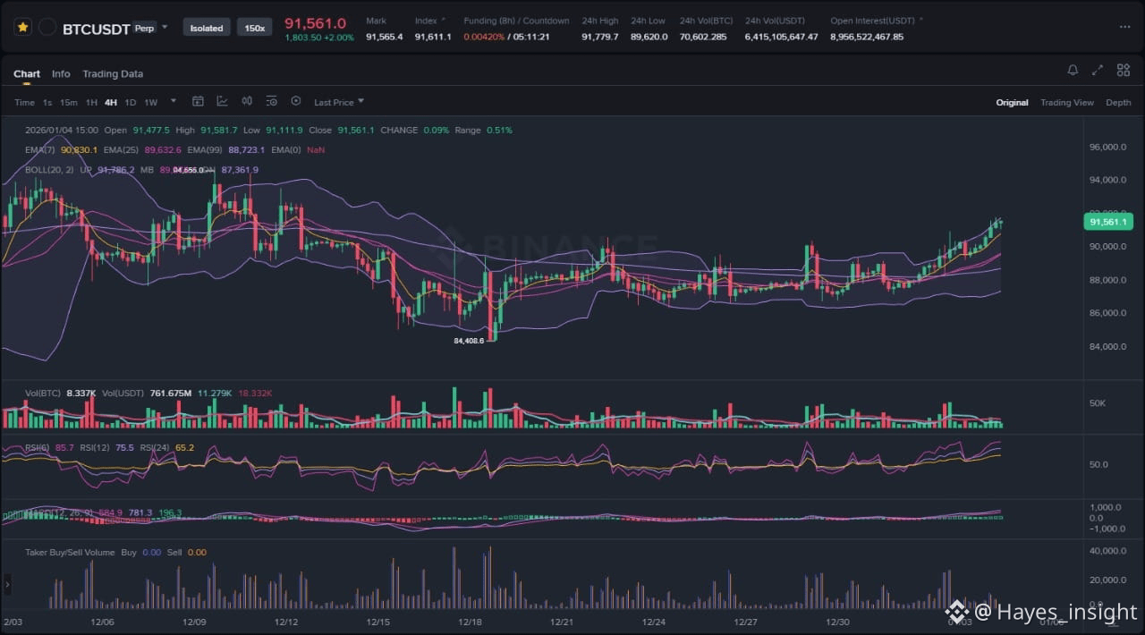 Diving deeper into the price action, the chart shows a textbook breakout attempt from a multi-week range, where BTC cleared the upper boundary near $90,000 on elevated volume. Key elements include a liquidity sweep below the range low earlier in the period, trapping shorts and fueling the subsequent impulse wave. Local swing highs now act as magnet points for retests, with the most recent rejection at $91,500 forming a potential distribution block if volume fades. The structure favors bulls as long as price respects the ascending channel's lower trendline, currently aligning with the 200-period SMA around $88,000. However, the approach to prior all-time highs introduces overhead supply risks, where mean reversion could test deeper liquidity if momentum wanes.