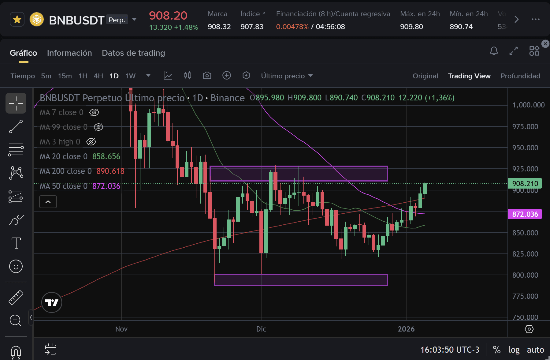 Dacă BNB reușește să mențină închiderea zilnică peste $900 - $905, drumul cu cea mai mică rezistență este în sus. Obiectivul logic următor ar fi să caute lichiditatea la nivelul de $920 - $930 această săptămână.🐻 Scenariu de Re-testare (Pullback):
