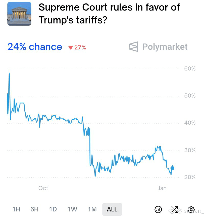 Markets are pricing a ~77% probability that the tariffs are ruled illegal.
