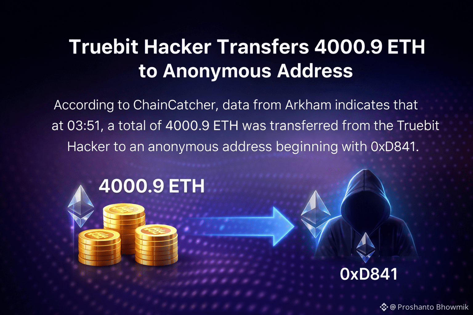 According to ChainCatcher, data from Arkham indicates that at 03:51, a total of 4000.9 ETH was transferred from the Truebit Hacker to an anonymous address beginning with 0xD841.