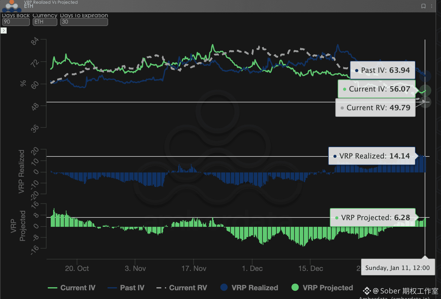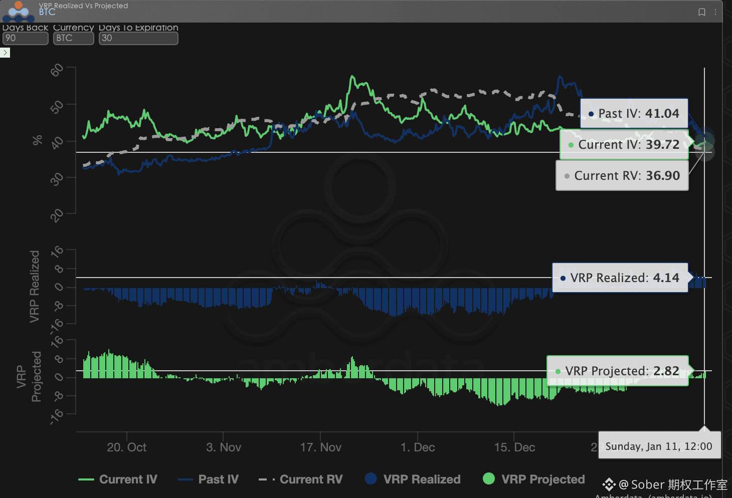 数据观察: 基于 90 天窗口期回测,本周 VRP Realized(已实现溢价) 显著高于 VRP Projected(预期溢价),且两者均维持在正值区间。