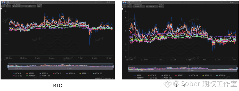 短端(ATM 1-7):深蓝线(ATM 1)和红色线(ATM 7)的波动最为剧烈。目前的快速回升说明,1 月 8 日的恐慌性抛售已经阶段性出清,短期 Gamma 风险得到释放。