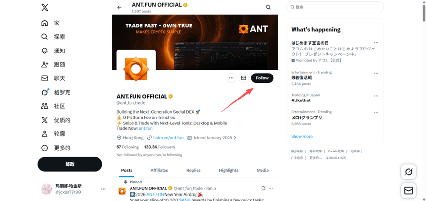 2、Când ai finalizat prima sarcină, apasă GO pentru a finaliza un follow pe Twitterul oficial. După ce ai terminat de urmărit, întoarce-te la pagina de recompense de la https://ant.fun/airdropny și așteaptă să poți revendica a doua sarcină, tot 500 ANB, cu o valoare de aproximativ 9.5u.