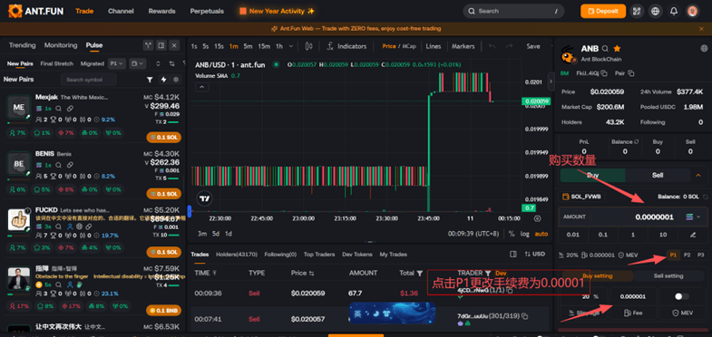 4、Sarcină interactivă, interacționează pe computer, depune direct 2u de SOL tokeni pentru a face o tranzacție, depune în portofelul pe care ți l-am spus să-l copiezi. Apoi apasă Go pentru a ajunge la pagina de tranzacții, apasă pe butonul de micșorare și schimbă cantitatea de cumpărare și comisionul P1 (opțiunea 1). Poți încerca cu 0.0000001/0.000001/0.00001 pentru a ști dacă achiziția a avut succes. După achiziție, păstrăm acest mic ANB, recompensele vor fi trimise ulterior, tokenii ANB vor fi de asemenea trimisi în acest portofel, iar SOL poate fi folosit și ca comision. Apoi, întoarce-te la pagina ta de recompense pentru a revendica 1000 ANB, aproximativ 19u.