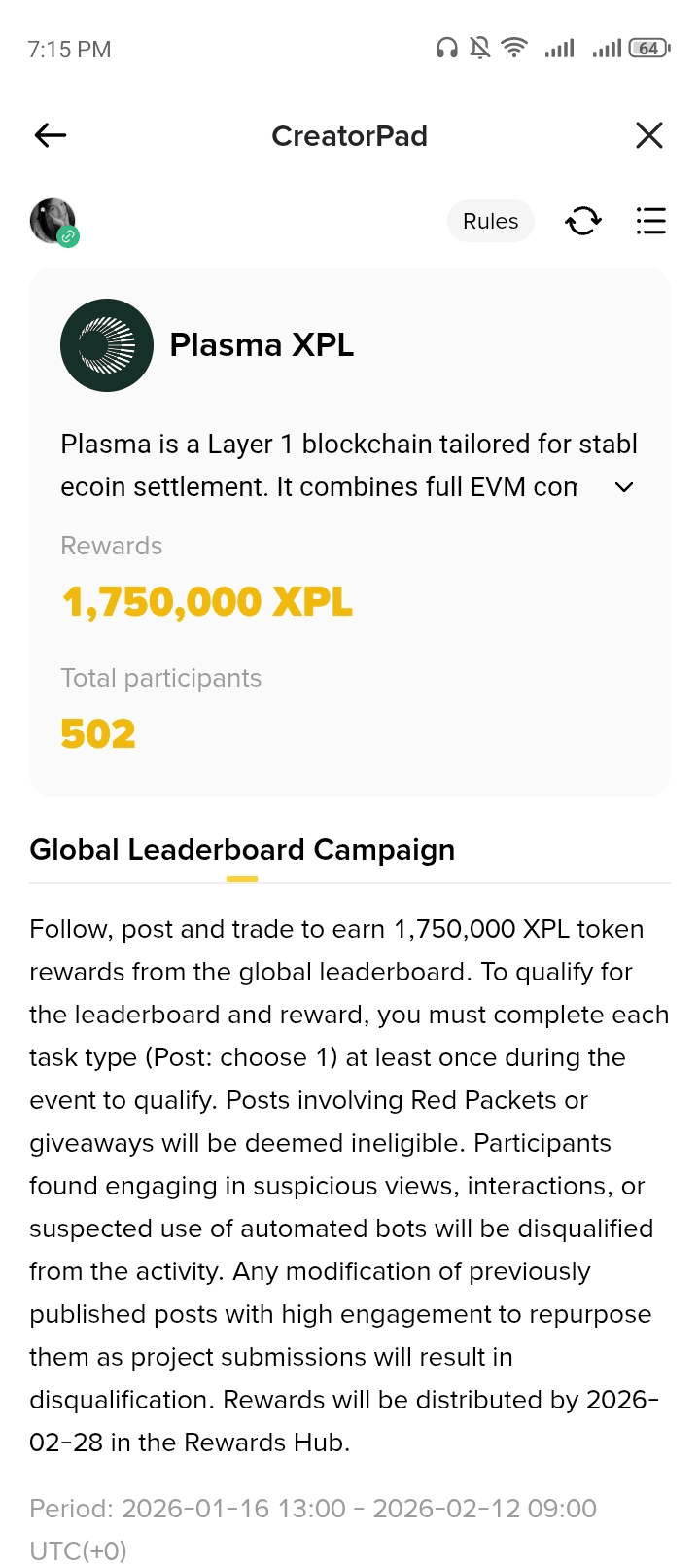 Publică cel puțin o piesă originală de conținut pe Binance Square folosind Editorul nostru de Articole, cu o lungime de mai mult de 500 de caractere. Postarea trebuie să menționeze contul proiectului @Plasma a, să eticheteze tokenul $XPL L și să includă hashtagul #Plasma a. Conținutul trebuie să fie strâns legat de Plasma și să fie original, nu copiat sau duplicat. Această sarcină este în curs până la sfârșitul campaniei și nu va fi marcată ca finalizată.