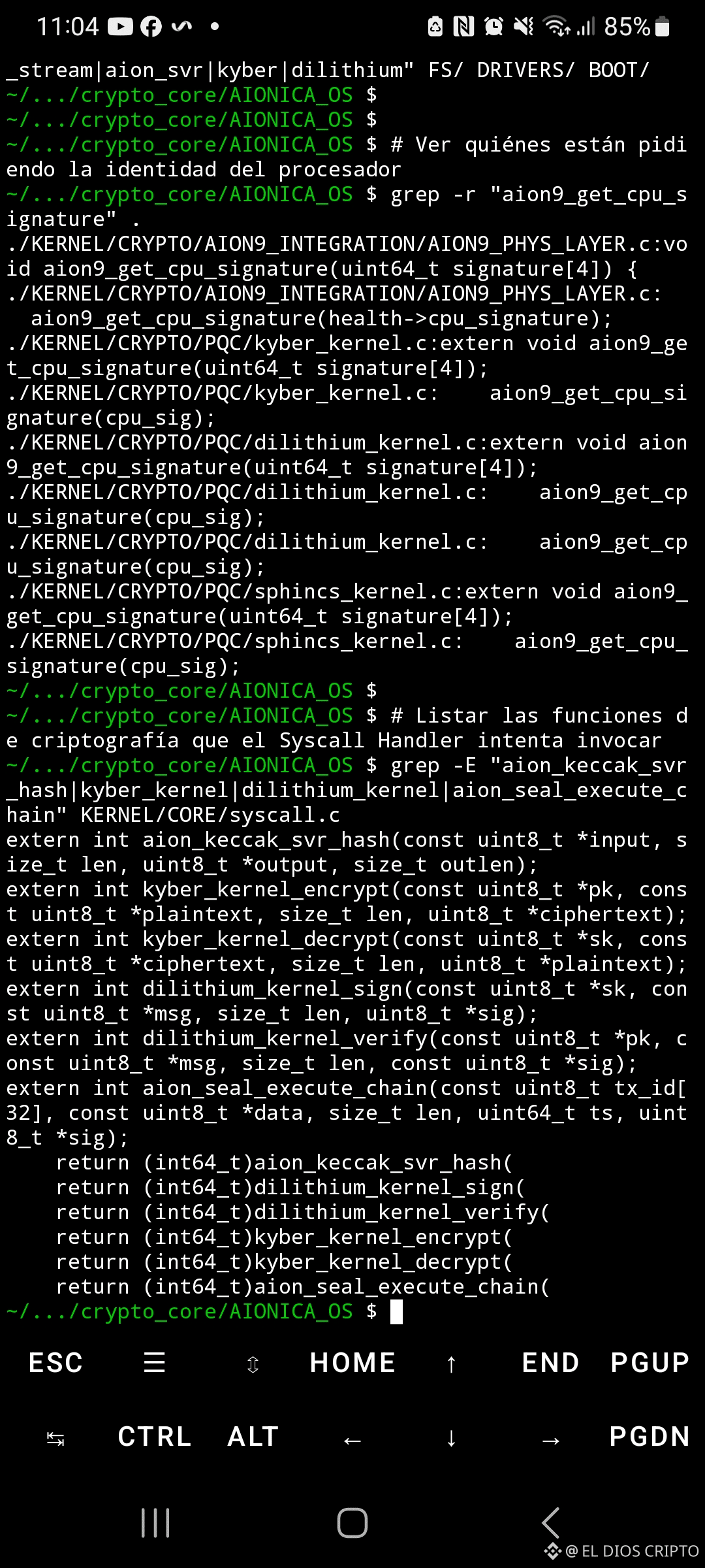 Mejora en AIONICA_OS: Integración nativa en kernel/syscalls (e.g., aion_sign/verify directamente a Dilithium/Kyber/SPHINCS con mods sovereign). No híbrido forzado; usa AION9 para noise/entropy real-time, lo que hace keygen más seguro y eficiente que libs genéricas. Superior para apps crypto-intensivas (e.g., blockchain), donde otros OS requieren migración gradual y arriesgan compatibilidad.