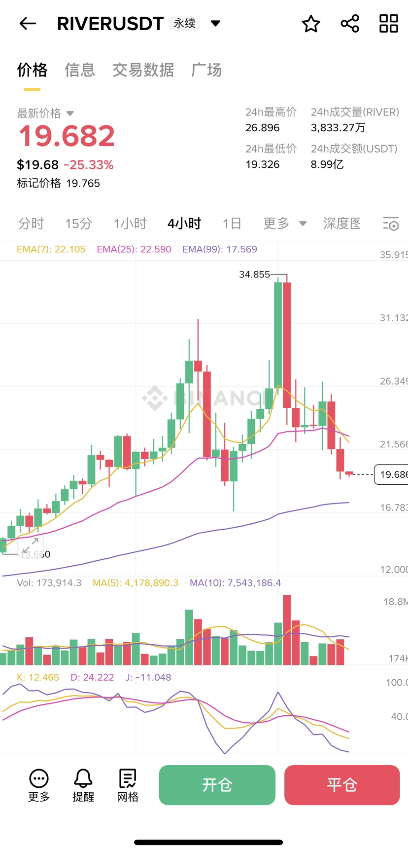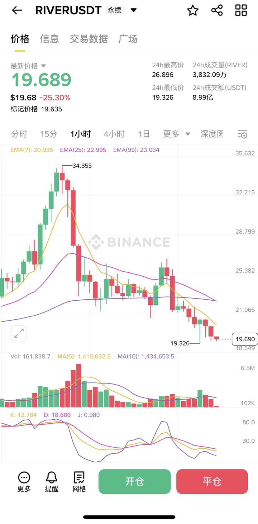 • Logică: EMA99 pe 4 ore (linie violet) este acum în jur de 17.5, iar prețul curent în jur de 19.6 are suportul minim anterior pe oră. Folosește divergența bullish de pe 1H KDJ pentru a intra.