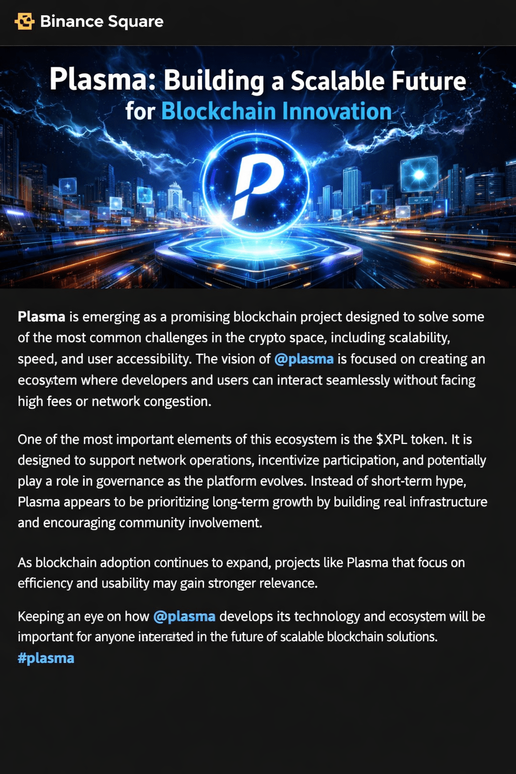 Plasma apare ca un proiect promițător de blockchain conceput pentru a rezolva unele dintre cele mai comune provocări din spațiul crypto, inclusiv scalabilitatea, viteza și accesibilitatea utilizatorului. Viziunea @plasma este concentrată pe crearea unui ecosistem în care dezvoltatorii și utilizatorii pot interacționa fără probleme, fără a se confrunta cu taxe mari sau congestie a rețelei.