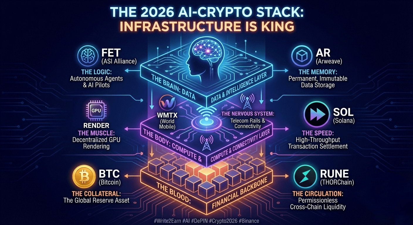 Dacă urmărești token-uri AI izolate fără a lua în considerare DePIN (Rețelele de Infrastructură Fizică Descentralizată) care le susțin, construiești pe nisip. Teza mea de bază pentru 2026 se învârte în jurul deținerii întregului "AI Stack." Iată cum este poziționat portofoliul meu $BTC, $FET, $AR , $RENDER, $SOL, $RUNE și $WMTX pentru anul acesta.