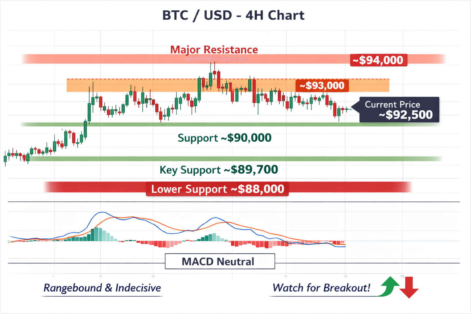 ✔ Interval lateral: BTC se tranzacționează într-un interval strâns de 4H între aproximativ $89.7K — $94K+.