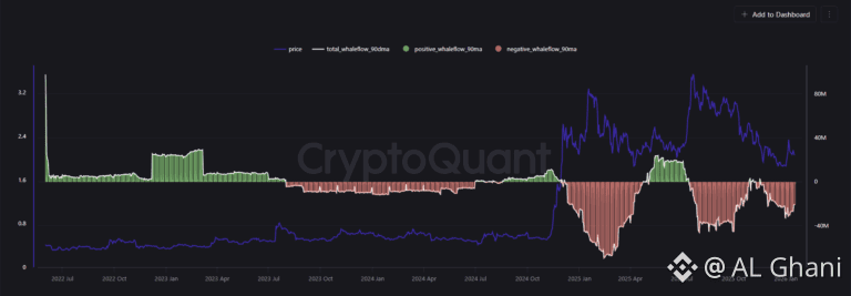 Although selling pressure has moderated compared to earlier phases, net outflows continue to hover near $20 million per day, indicating that whales have yet to fully step back from the market.