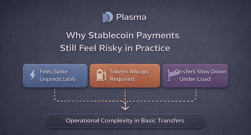Încercarea inițială de a folosi stablecoins pentru a face ceva normal devine evidentă că nu se potrivește. Are un activ stabil, dar nu o experiență stabilă. Transferul de dolari on-chain apare în continuare fragil în ambele sensuri care nu contează pentru tranzacționare și contează foarte mult pentru plăți. Taxele variază atunci când rețeaua este congestionată. Utilizatorii necesită un al doilea token pentru a transfera bani. Un transfer simplu poate acționa vast în răspuns la congestie.