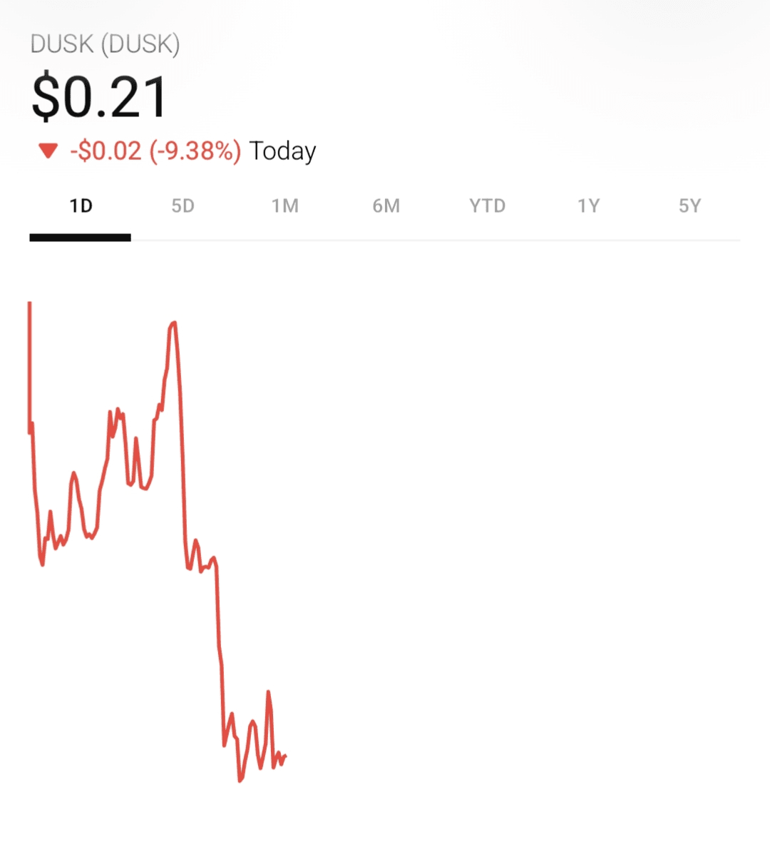 Dusk (DUSK) se tranzacționează în prezent la $0.21 pe Binance, cu o capitalizare de piață de 34 milioane de dolari. Prețul a înregistrat o scădere de 8.83%, indicând o potențială cădere ¹.