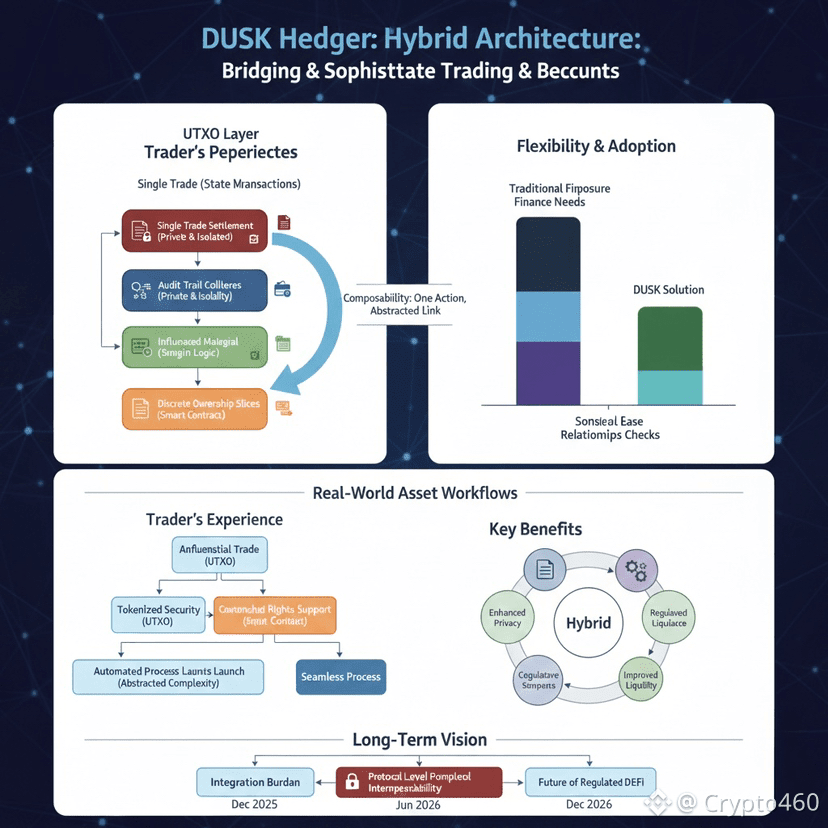 The Hedger exists to facilitate confidential trading. It is the counterparty for DUSK's obscured order books. Its job requires handling many discrete transactions simultaneously while also managing ongoing relationships and positions. This is where the hybrid idea shows its logic. The system can treat a single trade settlement as a confidential UTXO. That transaction is isolated and private. Yet the Hedger itself can maintain an internal account-based state. This state tracks overall exposure or user margins across many trades. The composability emerges from letting these two models talk to each other. The UTXO layer handles the finality of discrete events. The account layer manages the continuous state.