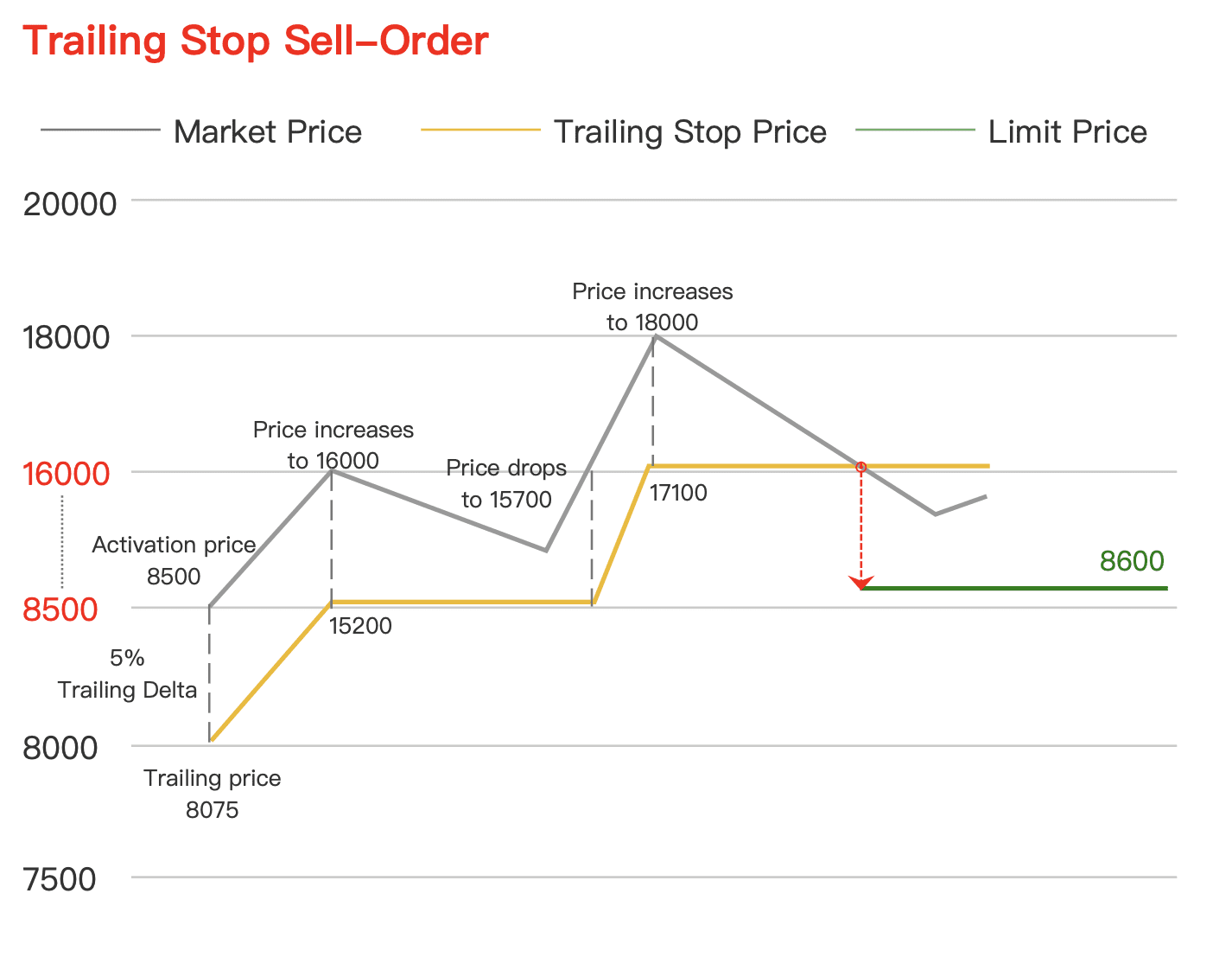 Traderul definește o distanță sau un procent de retragere în raport cu prețul actual.