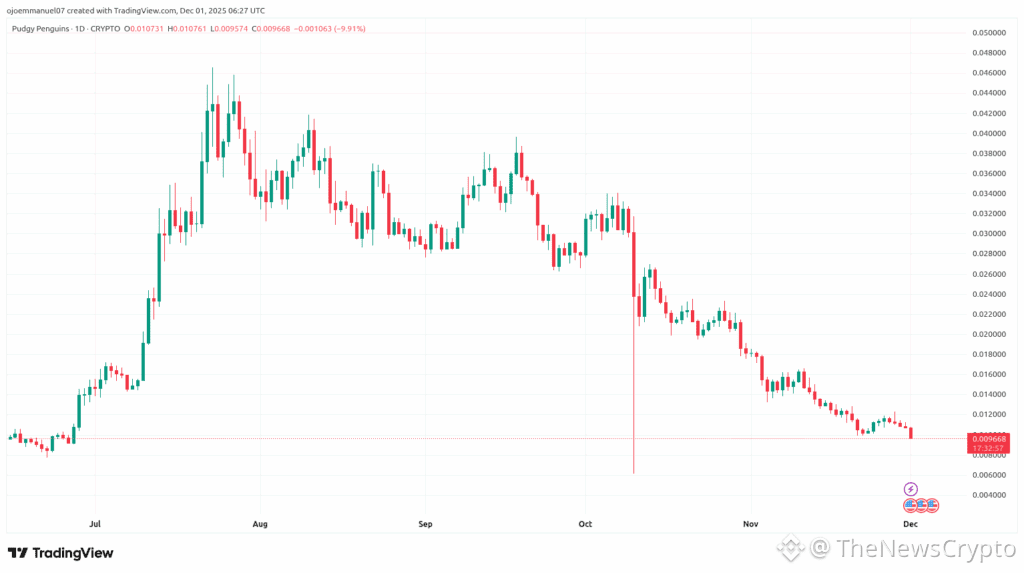 Pudgy Penguins is still trending down, sitting under all key averages - momentum signals hint at more softness ahead. Most traders expect a sideways range between $0.0090 and $0.0115 unless PENGU reclaims $0.0139.