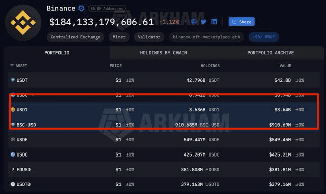 .Poziția în timp real pe Binance: conform datelor Arkham, cantitatea totală de USD1 deținută în prezent de Binance este de aproximativ 36.36 miliarde de dolari.