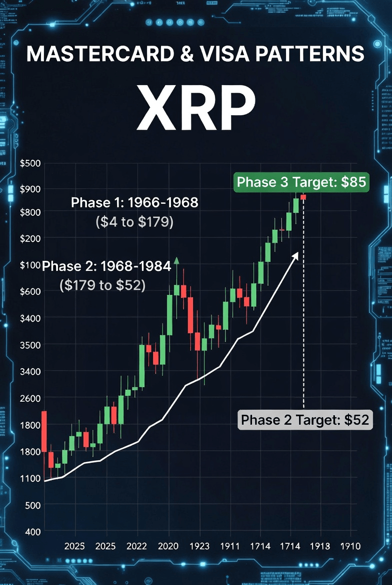 Compararea graficului lui Steph din Crypto servește ca un memento puternic că mișcările mari încep adesea în liniște, în configurații care par neobișnuite la prima vedere. Poziționarea actuală a XRP—trecând de la Faza 1 spre Faza 2—se aliniază cu preludiul acelor raliuri legendare în Mastercard și Visa.