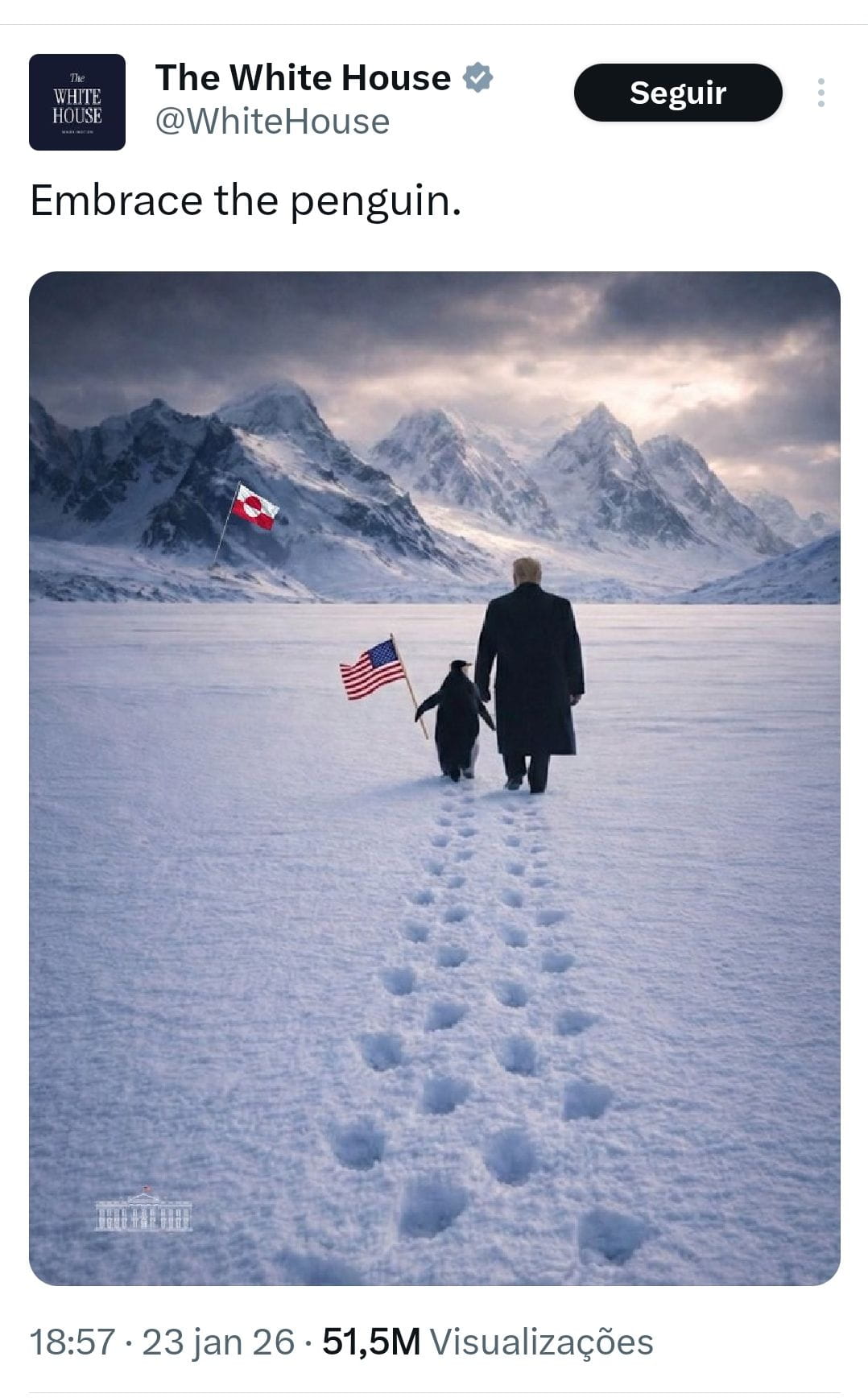 Trump, Groenlândia… e um pinguim que nem existe ali. A internet riu, os memes voaram — e o recado ficou claro: narrativas confusas geram volatilidade, desconfiança e reação imediata do público. No mercado é igual.