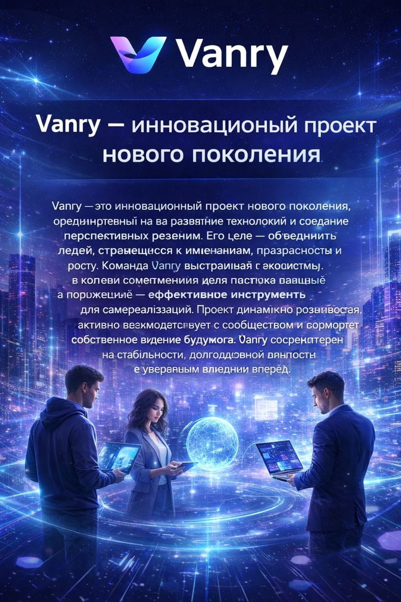 Vanry — это инновационный проект нового поколения, ориентированный на развитие технологий и создание перспективных решений. Его цель — объединить людей, стремящихся к изменениям, прозрачности и росту. Команда Vanry выстраивает экосистему, в которой современные идеи получают практическое воплощение, а пользователи — эффективные инструменты для самореализации. Проект динамично развивается, активно взаимодействует с сообществом и формирует собственное видение будущего. Vanry сосредоточен на стабильности, долгосрочной ценности и уверенном движении вперёд.