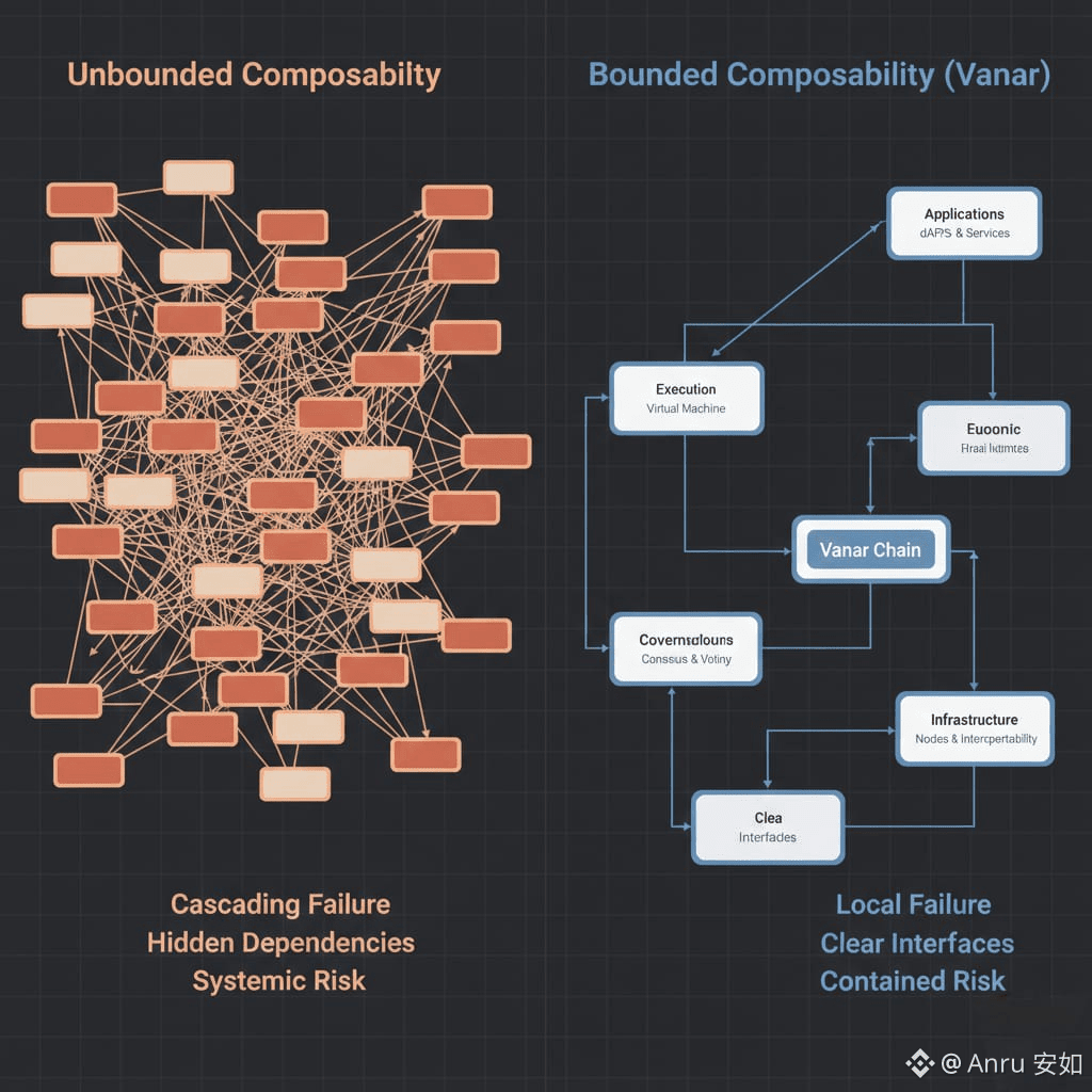 Vanar Chain approaches composability with an unusual restraint. Instead of maximizing how much can connect, it focuses on how connections are bounded. This distinction sounds subtle, but it has deep consequences for how the network evolves.
