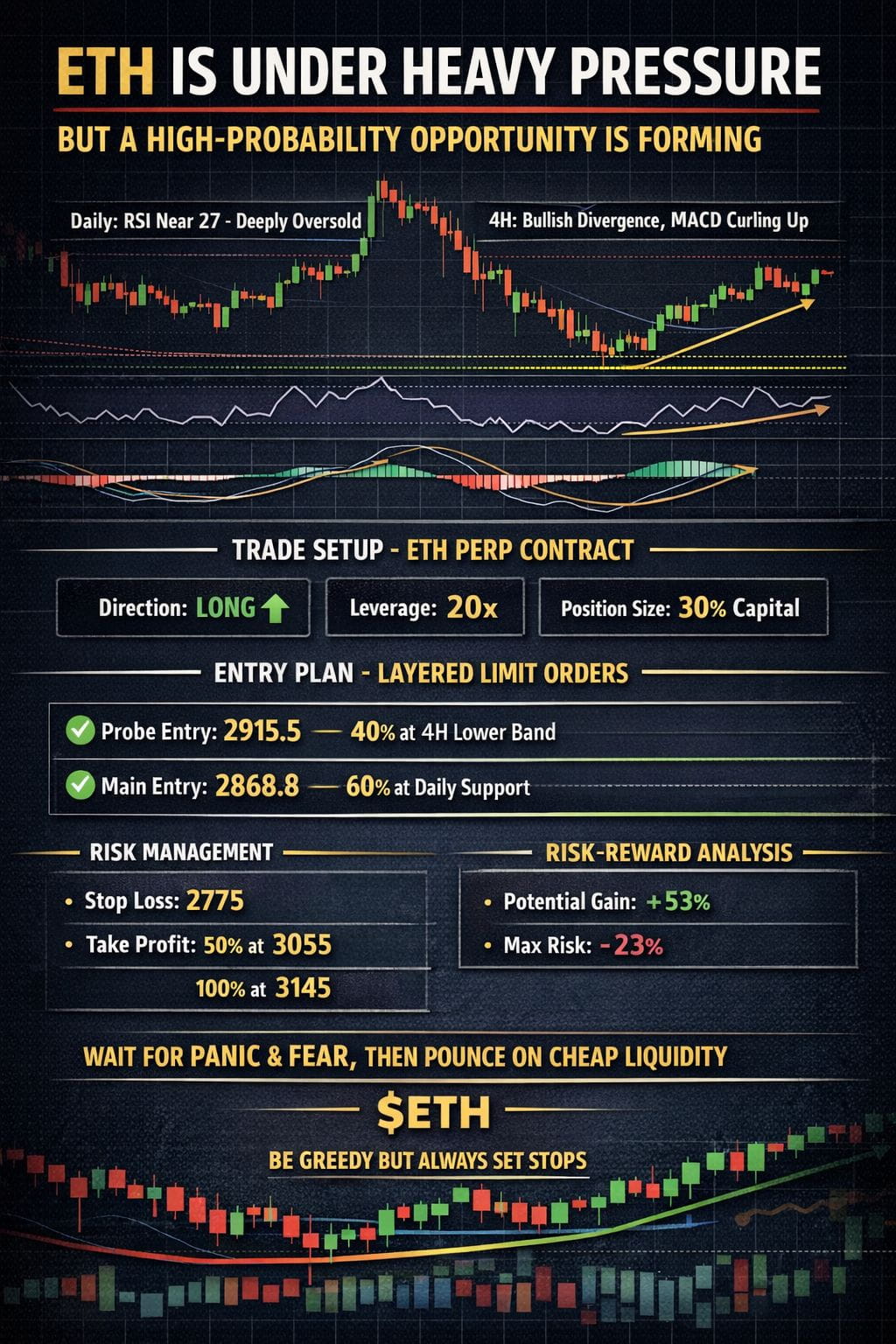 $ETH has been dropping aggressively, but after analyzing the technical structure and on-chain behavior, I believe a short-term rebound opportunity is approaching.