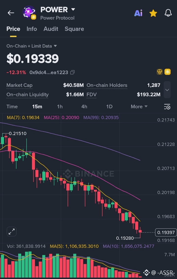 The current price is around $0.19339, down approximately 12.31%, indicating strong selling pressure during the recent session.