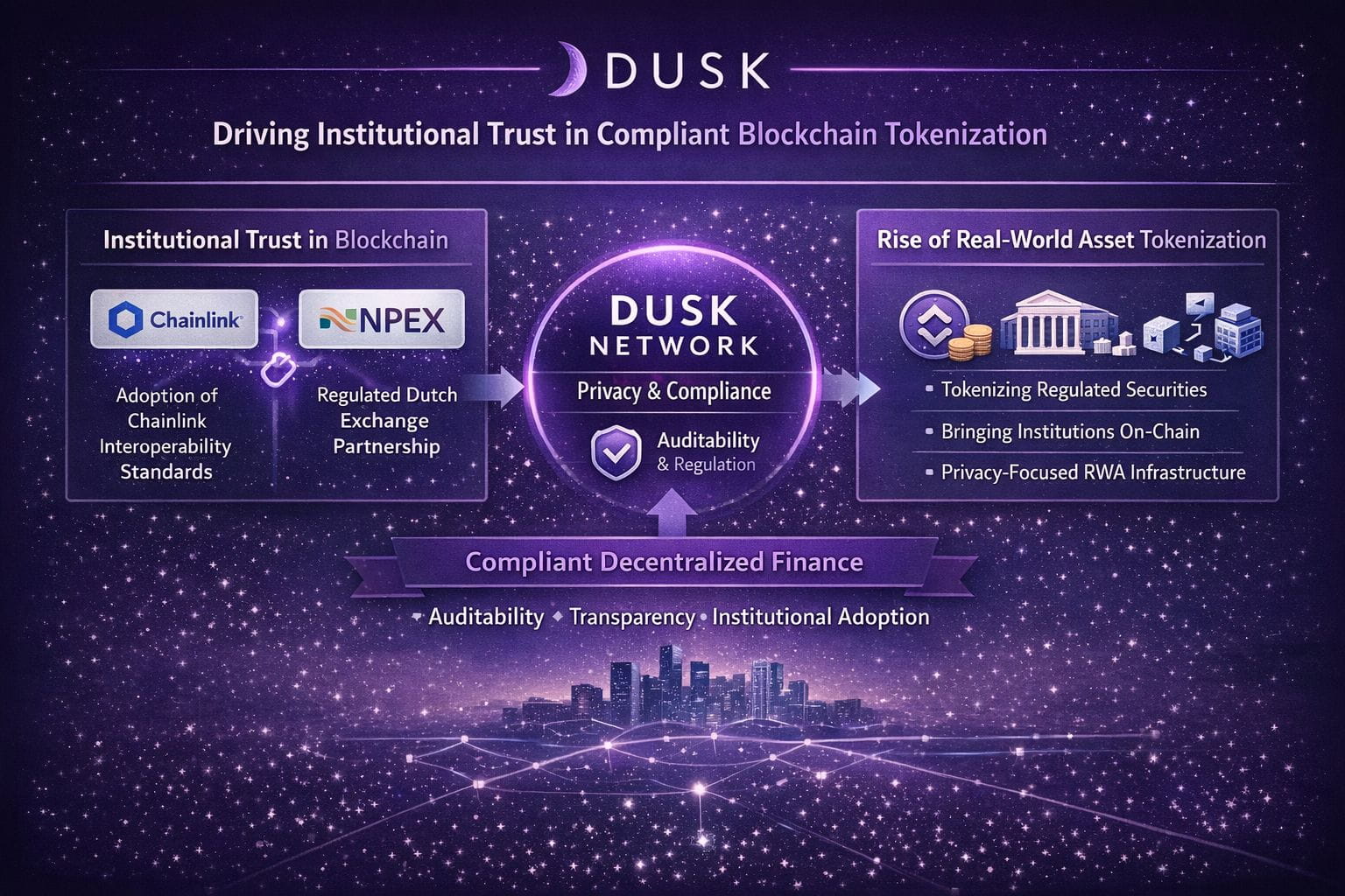 O dezvoltare remarcabilă în ultimele luni a fost adoptarea de către Dusk a standardelor de interoperabilitate Chainlink împreună cu bursa olandeză NPEX, deschizând calea pentru ca valorile mobiliare europene reglementate și activele instituționale să fie tokenizate pe blockchain cu auditabilitate și conformitate integrate.