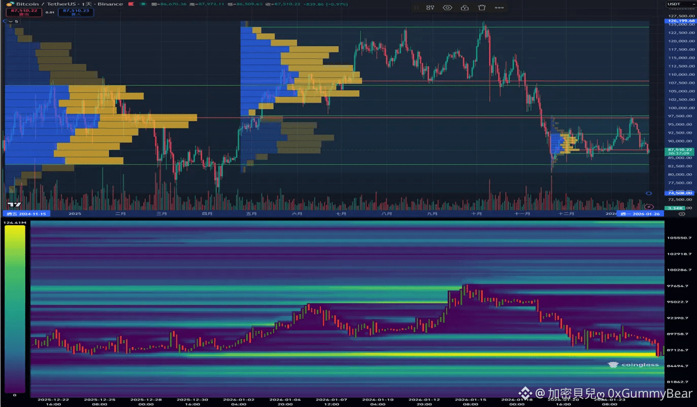 $BTC價格下跌測試$88,000支撐,下方支撐位為$82,000、$84,000,上方壓力位則是以$92,000、$97,000為主。從清算地圖來看,累積在$86,000的多頭流動性被清除,但下方還有流動性存在,價格依然有下探的可能。