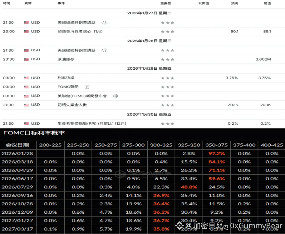 本週二、三(1/27、1/28)川普會進行公開講談話,可能針對美國政府潛在的再次停擺、美日匯率波動以及地緣政治等議題進行發言,市場情緒目前處於敏感時期,任何潛在的利空訊息都容易被放大。本周四(1/29)會公布利率決議,目前市場已經預期1月不會進行降息,後續可以留意FOMC新聞發布會內容以及點陣圖是否有變化。