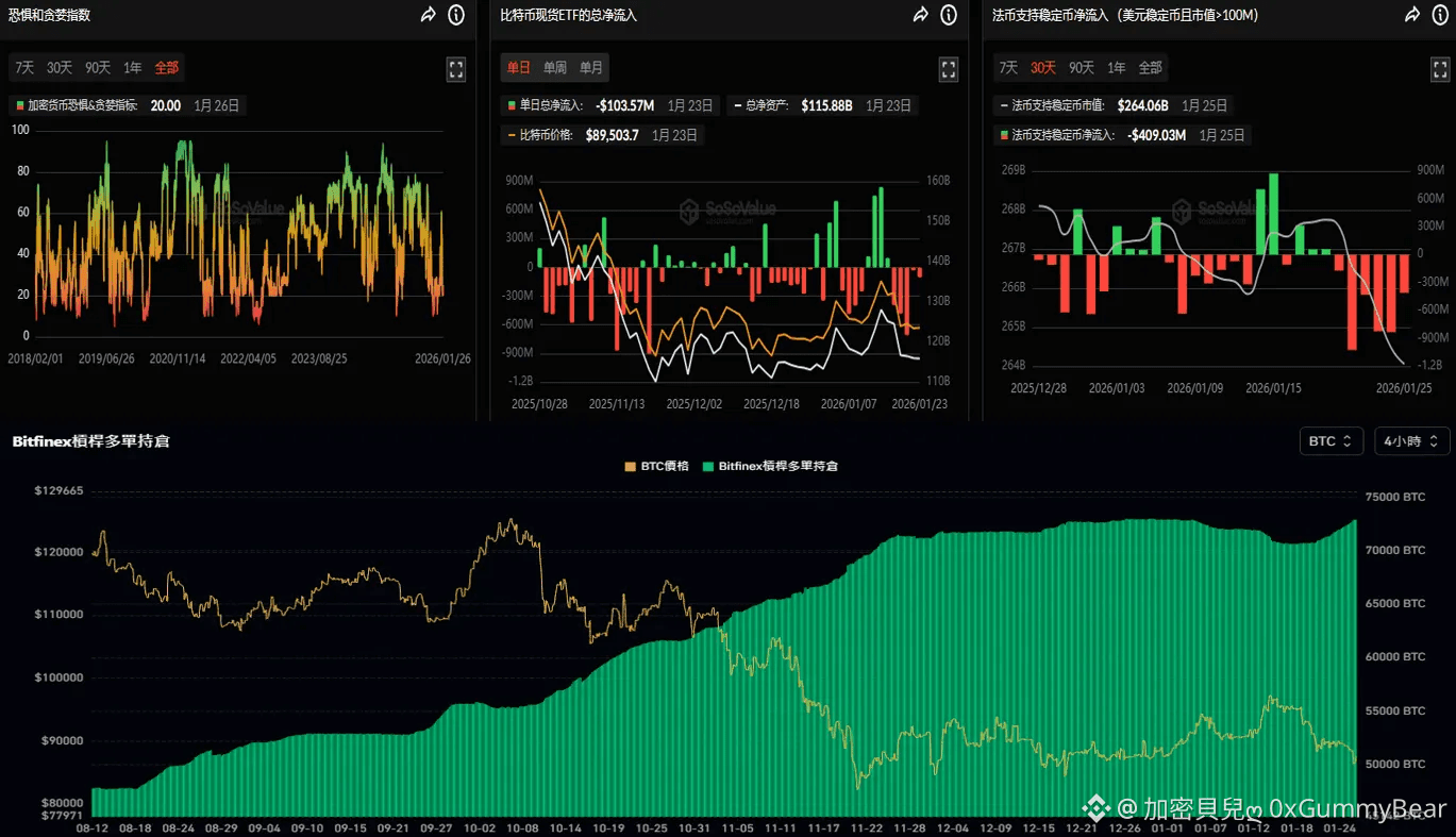 Sosovalue數據上,恐懼貪婪指數跌至恐懼水平。$BTC ETF資金保持連續5天淨流出,大額穩定幣保持6天淨流出,整體市場情緒偏空。而綠葉數據則呈現逆勢增長,BTC價格的下跌反而使多頭累積槓桿回到前高水平。