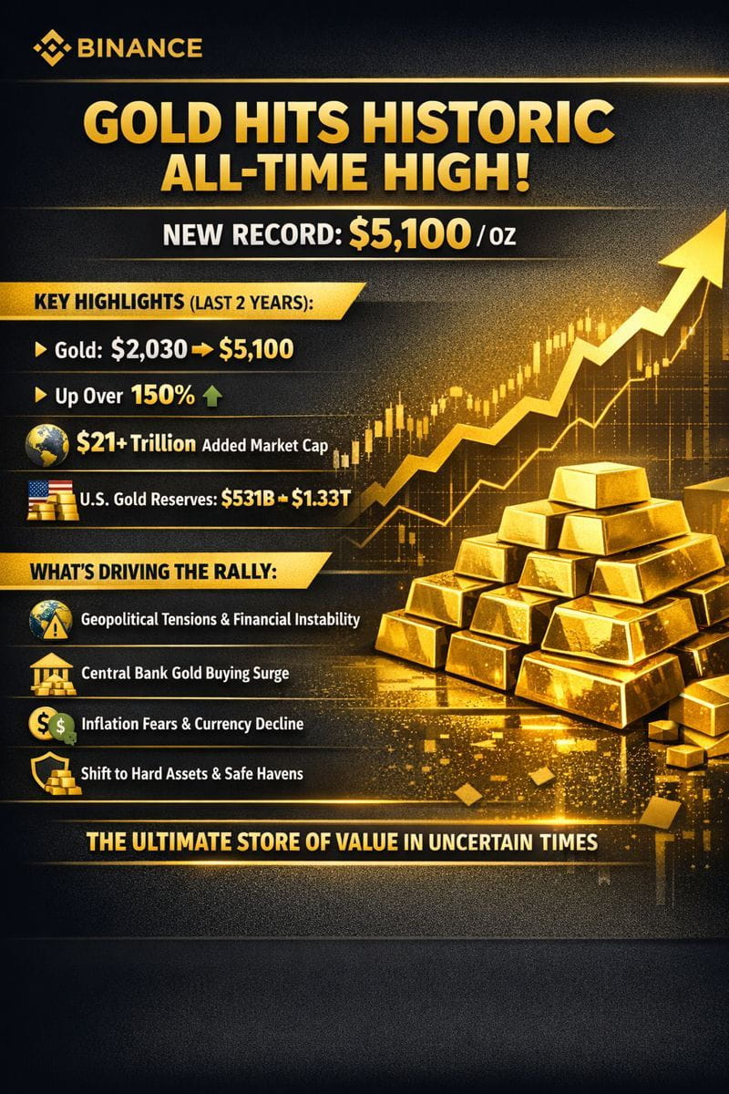 Gold is on a historic rally, reaching a new all-time high of $5,100 per ounce, driven by global economic uncertainty, aggressive central-bank buying, and weakening confidence in fiat currencies.