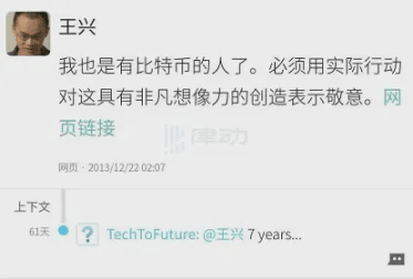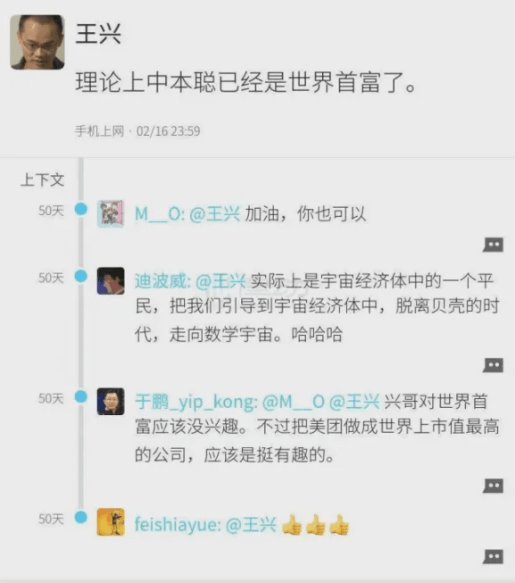 În februarie 2021, când prețul Bitcoin a depășit 50.000 de dolari, Wang Xing, fondatorul Meituan, a făcut o declarație pe Fanfou pe 16 februarie. Satoshi Nakamoto este recunoscut pe scară largă ca părintele Bitcoin și deține 1,12 milioane de Bitcoin. La doar două luni după declarația lui Wang Xing, prețul Bitcoin a crescut cu încă 30%, depășind 64.000 de dolari.