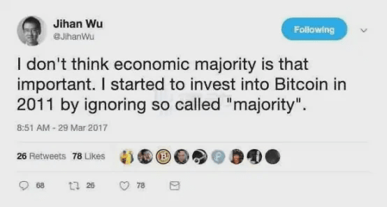 Într-o zi din martie 2017, Jihan Wu a scris pe Twitter: „Nu cred că majoritatea economică contează. Am ignorat așa-numita majoritate când am început să investesc în Bitcoin în 2011.” A decis să o ia de la capăt și să nu se mai joace cu Bitcoin Core.
