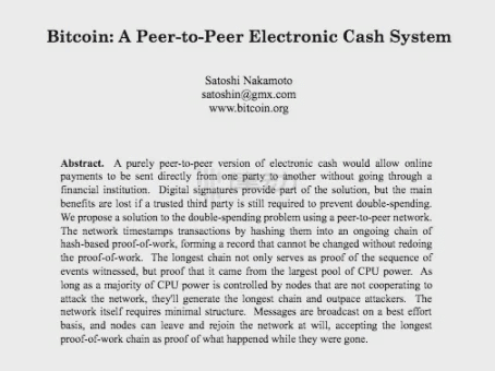 În noiembrie 2008, a fost publicat online un articol scris de Satoshi Nakamoto, intitulat „Bitcoin: Un sistem electronic de numerar peer-to-peer”. Articolul detalia modul de utilizare a rețelelor peer-to-peer pentru a crea un „sistem de tranzacții electronice fără încredere”.