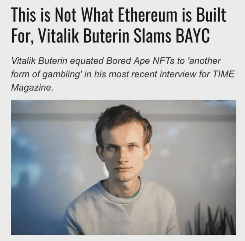 „Nu pentru asta a fost construit Ethereum!” Aceasta a fost evaluarea lui Vitalik despre BAYC într-un interviu acordat revistei Time în martie 2022. Chiar și în ecosistemul divers Ethereum, dezvoltarea „giganților IP” NFT precum Yuga Las nu este recunoscută de dezvoltatorii OG.
