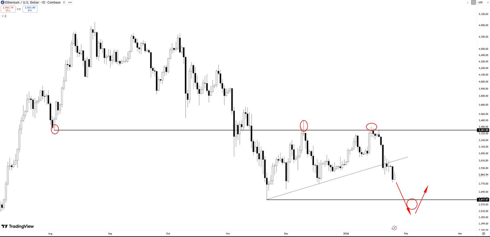 2:eth este o zonă paralelă. Putem observa o rezistență puternică foarte clară între 3350-3400, iar sub 2650 a fost atinsă o dată, așa că este foarte probabil să fie atinsă din nou la fel ca rezistența de sus.