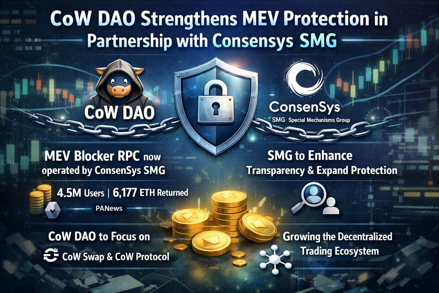 #CoW DAO has announced that operation of its MEV protection tool, the #MEV Blocker #RPC , will be taken over by Consensys’ Special Mechanisms Group (SMG). According to PANews, the tool has already been used by more than 4.5 million users and has helped return 6,177 #ETH to them. Going forward, SMG plans to improve transparency with a stronger focus on users and broaden the scope of protection. At the same time, CoW DAO will concentrate on further strengthening MEV protection through CoW Swap and the CoW Protocol, supporting the continued expansion of its decentralized trading ecosystem.