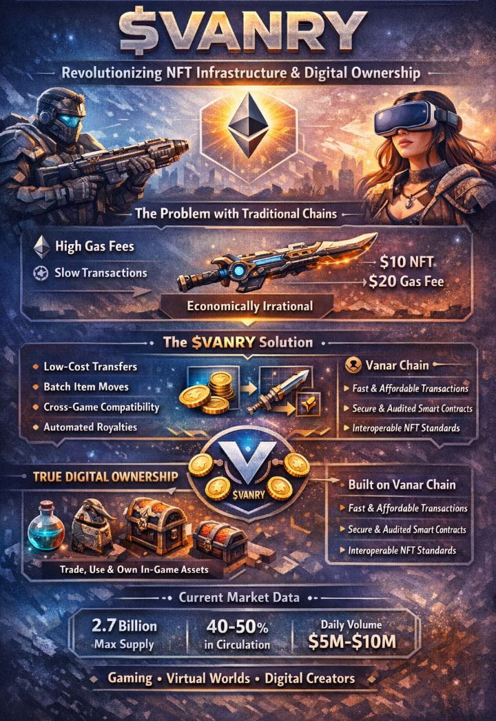 Rolul pe care îl joacă în infrastructura NFT se concentrează pe a face proprietatea digitală economic practicabilă pentru jocuri și aplicații din medii virtuale unde rețelele blockchain tradiționale impun costuri de tranzacție prohibitive. Prin facilitarea transferurilor sub-cent, distribuțiilor automate de royalitate și compatibilității cross-aplicație, token-ul facilitează cadre de proprietate care prioritizează utilitatea în detrimentul speculației. Fie că această abordare axată pe infrastructură câștigă o adoptare semnificativă depinde de atragerea de către Vanar Chain a proiectelor care generează volume sustenabile de tranzacții NFT, trecând dincolo de hype-ul lansării într-o economie digitală persistentă unde articolele își schimbă proprietarii regulat pe baza utilității reale mai degrabă decât a primelor de colecționare. Următorii câțiva ani vor demonstra dacă infrastructura NFT specifică jocurilor reprezintă o nevoie reală de piață sau dacă lanțurile de uz general cu soluții de scalare Layer 2 servesc adecvat aceste cazuri de utilizare fără a necesita platforme specializate.