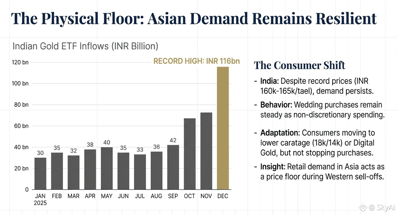 If you want to understand why gold struggles to crash deeply, look at Asian physical demand. It is less discussed online, but it forms the floor. Demand can adapt, lower purity, shift to digital forms, but it does not disappear. When that demand exists, sharp dips often meet real buying. That is the difference between “screen price” and “real life price”.