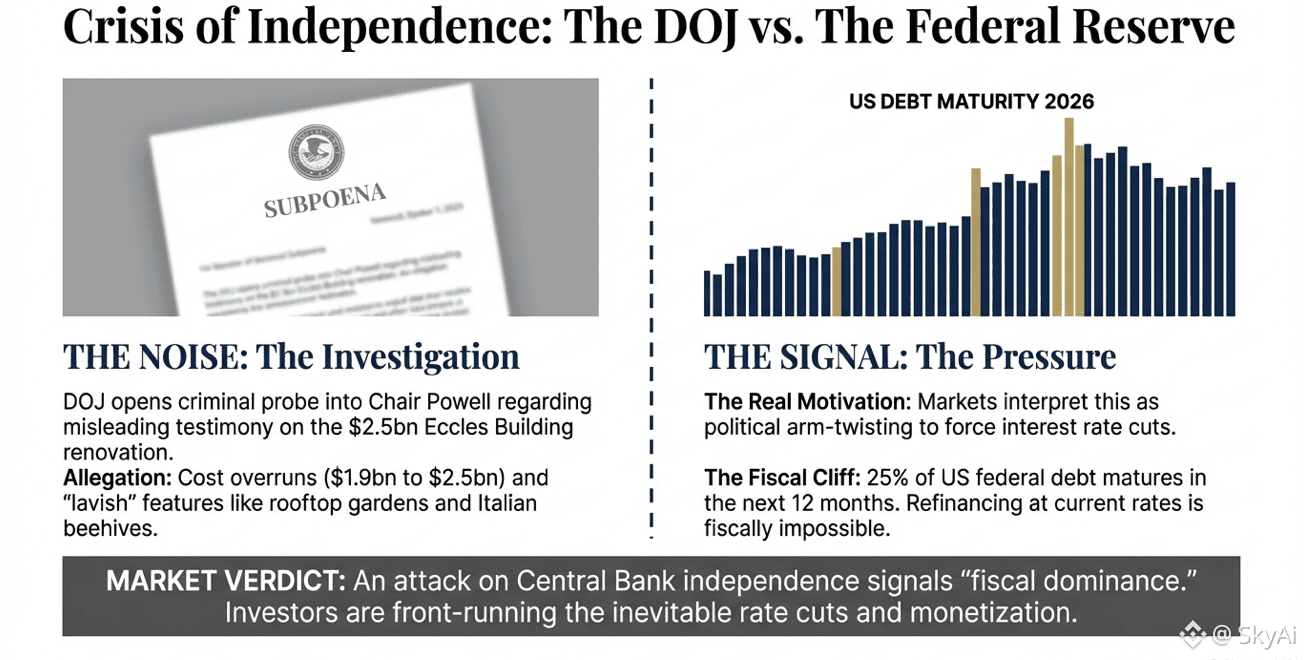 The Fed investigation narrative is interpreted in a cold, market way: if central bank independence is questioned, policy expectations become less stable. Policy instability raises the premium for defensive assets. Most importantly, markets move first. They do not wait for moral conclusions. They only need the risk to be plausible to start reallocating.