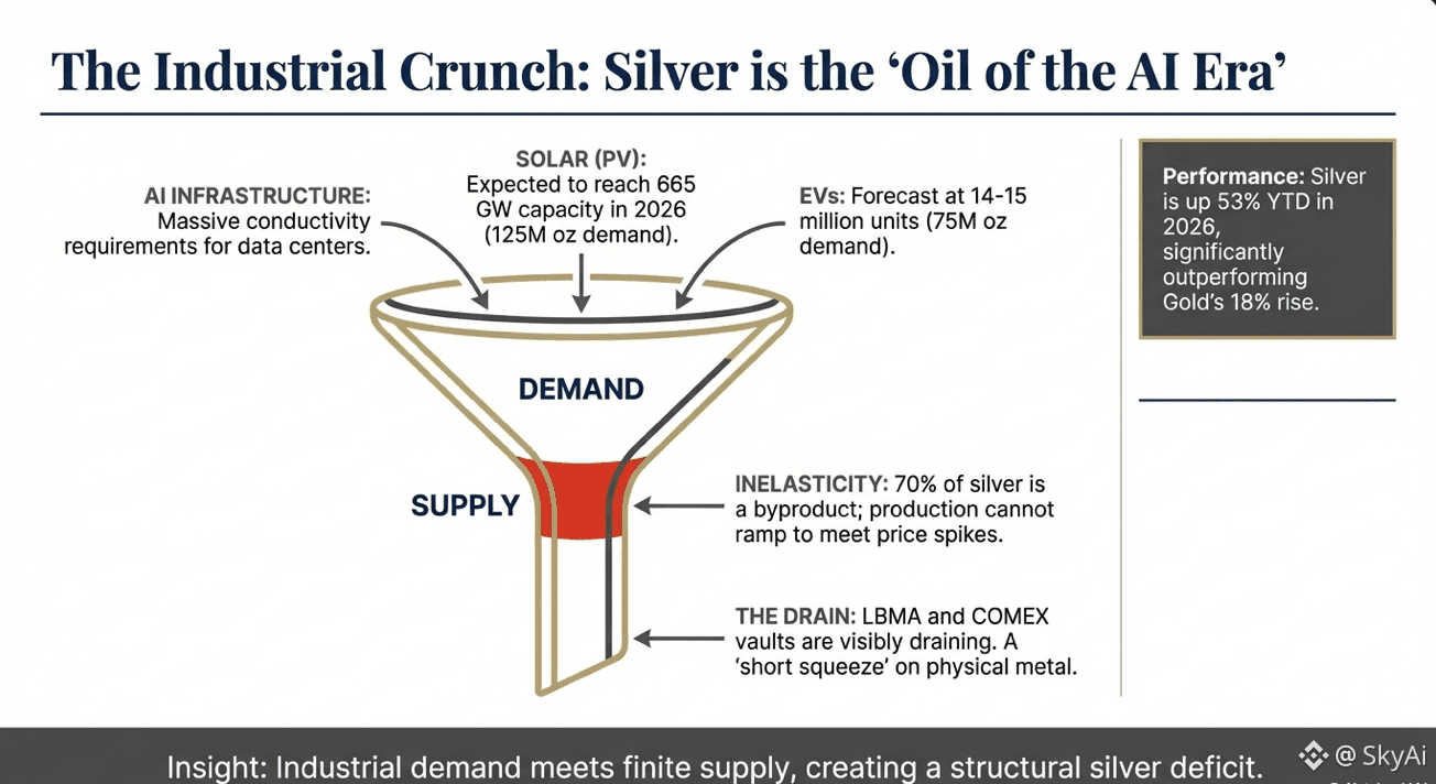 Silver is the metal of electrification and the AI era because it sits in critical, hard to replace links across conductivity, energy, and hardware. The bottleneck is supply: much of silver is a byproduct, so production cannot scale quickly with price. When industrial demand rises steadily while supply responds slowly, markets price in “persistent shortage”. In that regime, silver does not move like a meme. It moves like a strategic commodity.