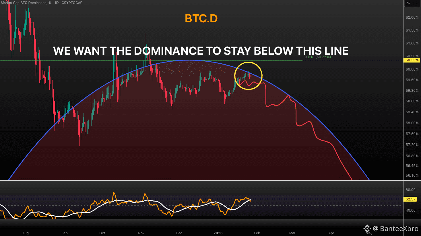 ⚠️ However, a decisive reclaim above 60.35% would invalidate this scenario and shift momentum back toward Bitcoin dominance.