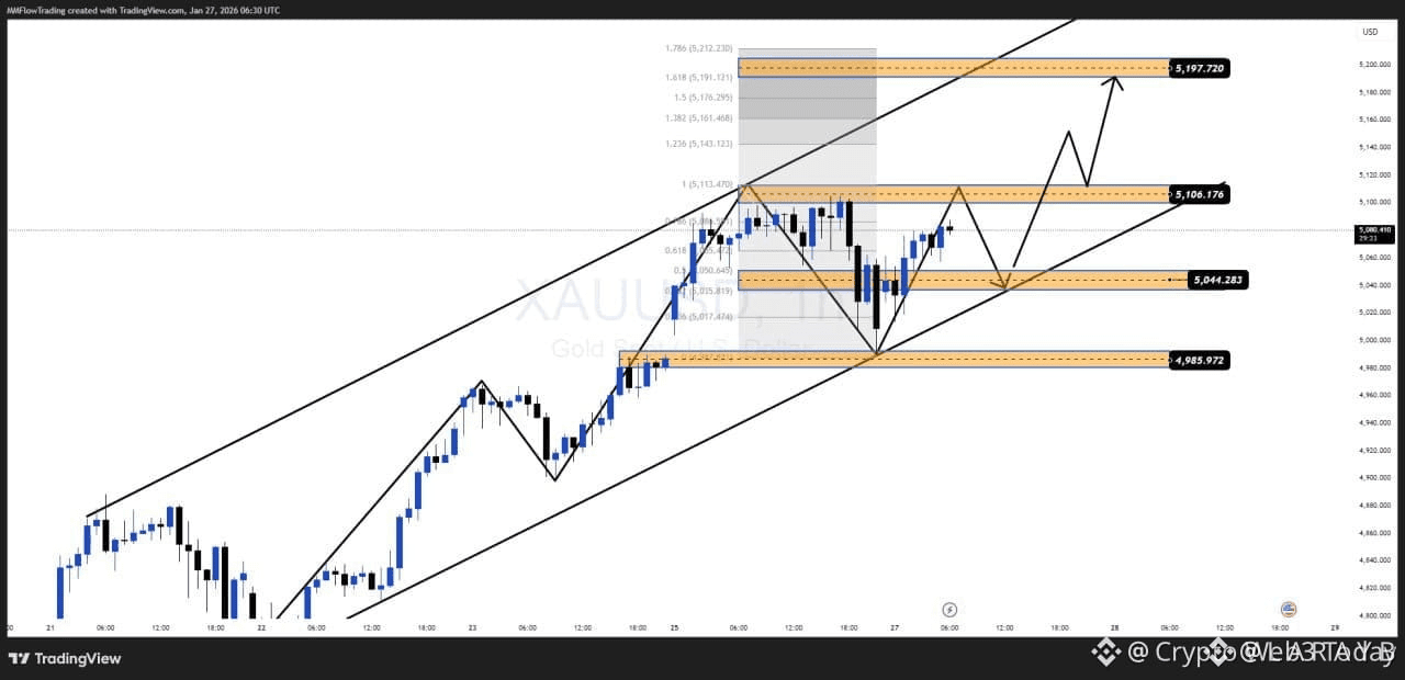 Gold continues to trade within a strong bullish channel, maintaining its ATH expansion structure. The recent pullback is corrective in nature and shows clear signs of liquidity absorption rather than distribution.
