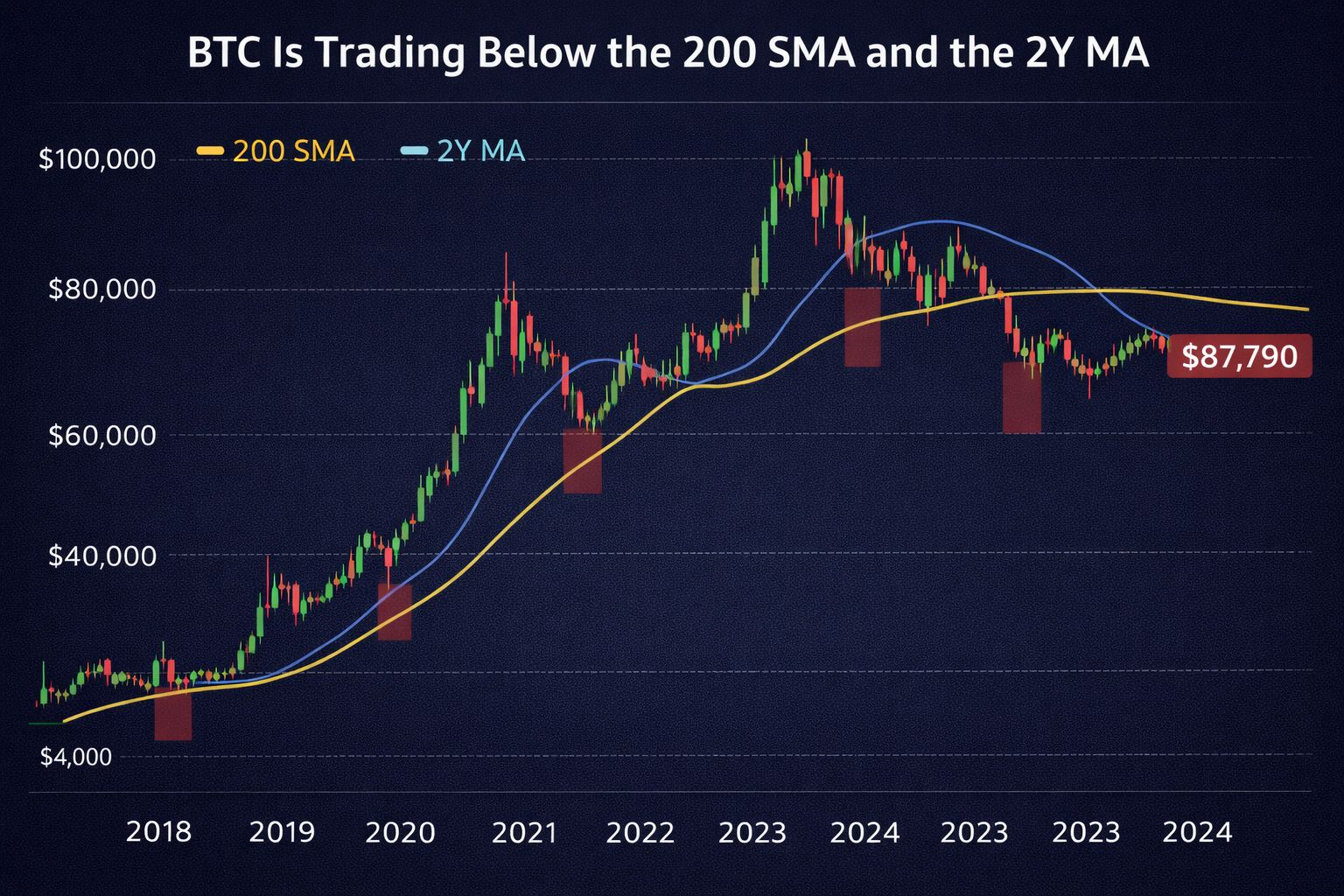 BTC se tranzacționează în prezent sub indicatori cheie pe termen lung, inclusiv SMA de 200 de zile și Media Mobilă pe 2 ani, o condiție care apare istoric doar de câteva ori pe ciclu. Acest lucru nu confirmă un minim, iar o scădere suplimentară rămâne posibilă. Cu toate acestea, atunci când prețul se tranzacționează în această zonă, profilul risc-recompensă începe să se schimbe, cu scăderea devenind mai definită în raport cu creșterea pe termen lung.