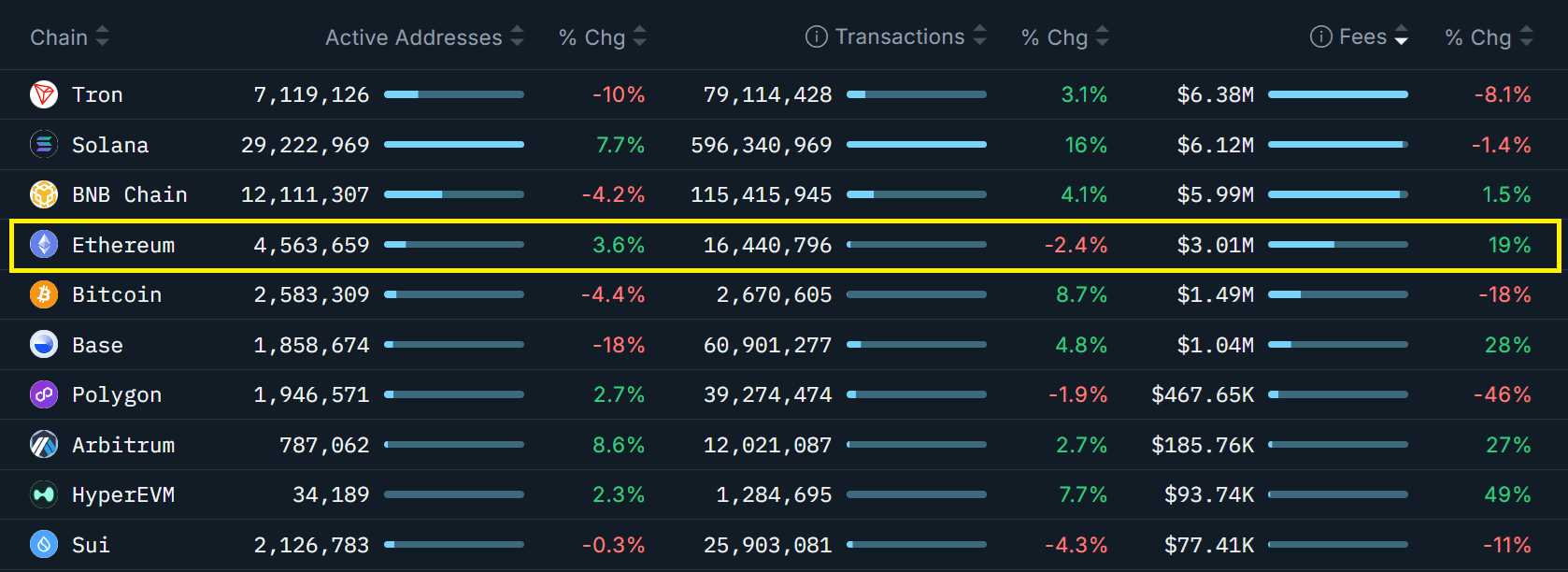 Taxele rețelei Ethereum au crescut cu 19% în ultima săptămână, în timp ce competitorii Tron și Solana au înregistrat scăderi în raport cu tendințele lor recente. Mai important, numărul total de tranzacții pe layer-2-urile Ethereum a crescut la 128 milioane, depășind totalurile de pe BNB Chain și Tron. Acest lucru sugerează că ecosistemul Ethereum poate scala eficient fără a sacrifica utilitatea sa de bază.