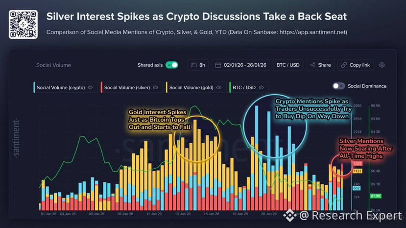 The chart from Santiment visualizes this rotation in real time. Social media mentions of crypto, gold, and silver are plotted against Bitcoin’s price, and the pattern is almost painfully on-the-nose. As Bitcoin peaks and begins to slide, gold-related chatter surges — a classic “risk-off” reflex. When Bitcoin traders attempt to buy the dip, crypto mentions briefly spike again, only to fade as the price fails to recover. That’s when silver takes over the spotlight, with social volume exploding just as silver prices push into new highs. The image effectively maps retail psychology: attention migrates from speculative assets to perceived safety, then back to higher-volatility plays, all driven less by fundamentals and more by momentum, price action, and crowd behavior.